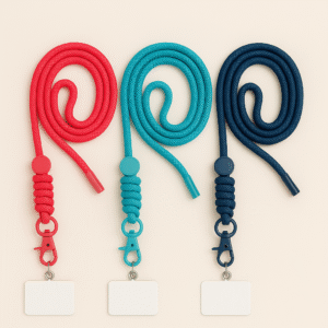 Adaptador universal con cordón efecto muelle, disponible en tres colores. Compatible con fundas estándar. Práctico, resistente y perfecto para llevar tu móvil colgado.