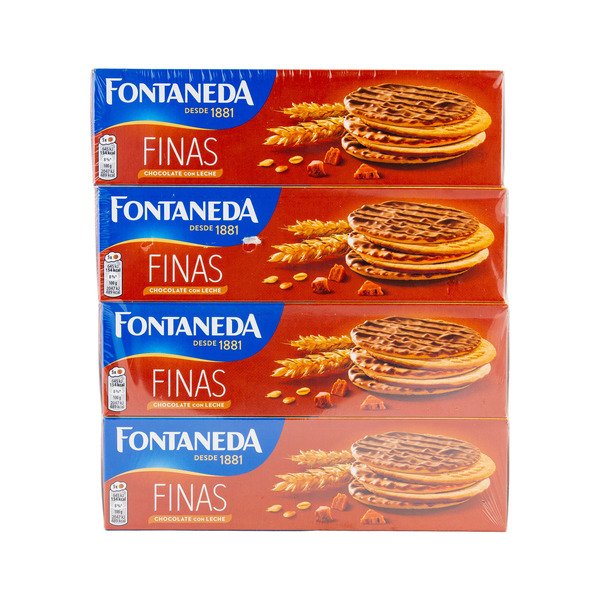 Las galletas finas de Fontaneda bañadas en chocolate con leche son el capricho ideal. Este pack de 4 cajas asegura calidad al precio más barato.